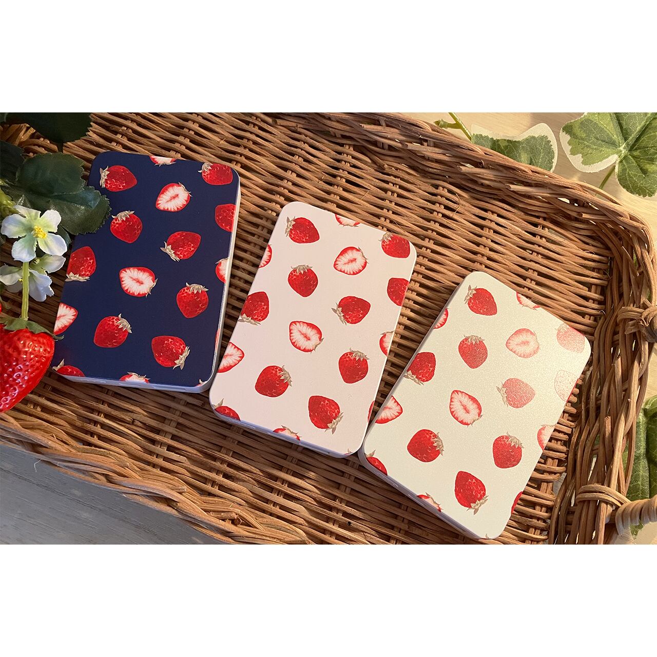 王道ホワイト、キュートなピンク、大人っぽいネイビーの三色展開のいちご柄シリーズ。